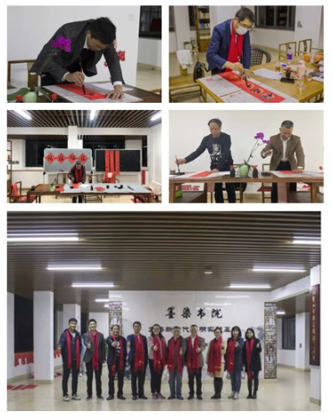 活动现场融十九届六中全会知识问答、师生共创书写对联等方式打造多元的新时代文明基地,设置展览区、书写区、知识问答三个区域,春联内容以宿舍为单位创作,师生挥毫泼墨,一同写春联、写福字,切磋技艺,在欢声笑语中共迎新春。