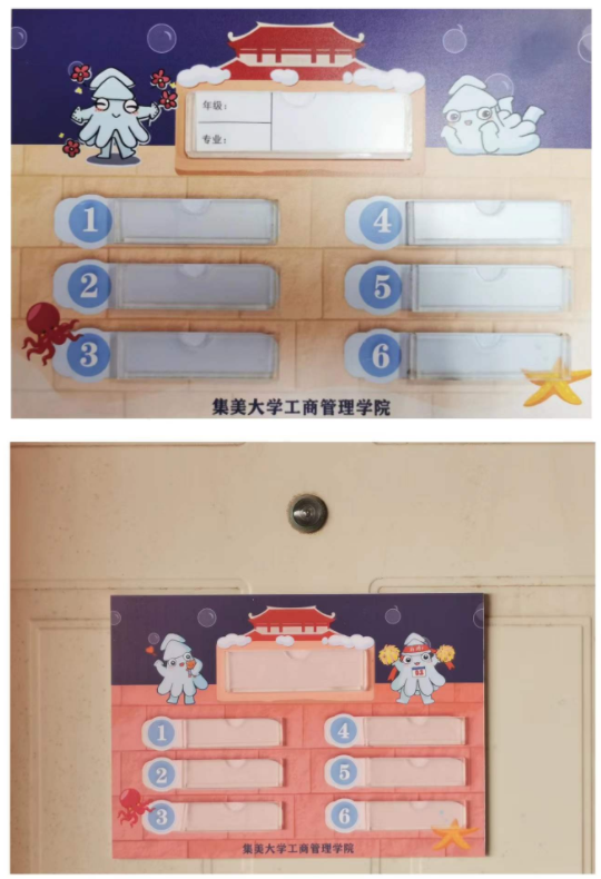 活动依托宿舍文化门牌设计、优良学风宿舍评比、宿舍卫生周评比等逐项进行,其中宿舍门牌结合学院学科特色和学子风采,融入学院吉祥物“小管”形象,根据男女生宿舍性别差异进行区分,并体现出宿舍成员、宿舍名等关键信息,成为每间宿舍独一无二的文化名片。