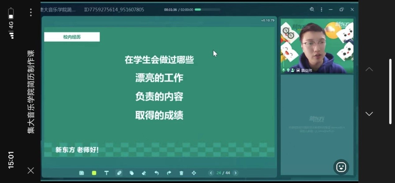 为加强音乐学院毕业生的简历制作能力和水平,提高毕业生的就业竞争力,助推毕业生早日就业,3月14日下午,音乐学院通过线上授课的方式开展了“简历制作技巧提升”培训活动,本次培训会主讲嘉宾为新东方詹燊玮老师,音乐学院大四毕业生参加了此次培训。