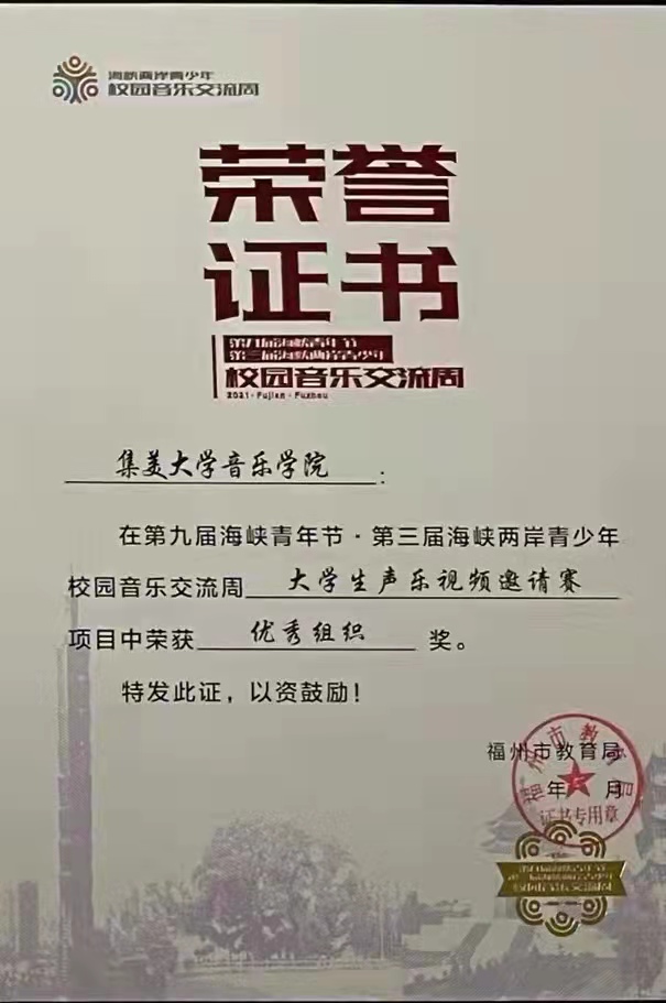 日前,在第九届海峡青年节暨第三届海峡两岸青少年校园音乐交流周——首届海峡两岸大学生声乐视频比赛中,音乐学院学生获得三金一银两铜的好成绩,学院也因此荣获优秀组织奖。