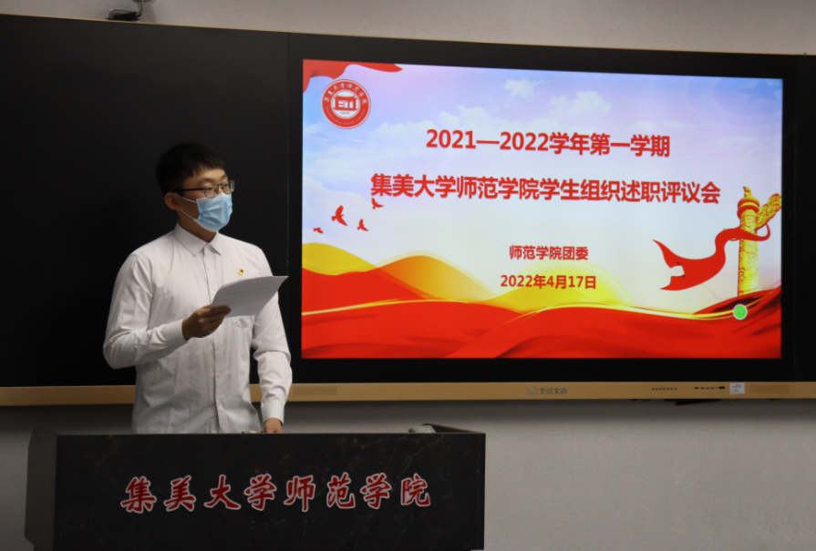 为进一步促进学生组织工作的顺利开展,建设作风优良、服务学生的组织体系,师范学院于4月17日下午在吕振万楼智慧教室开展2021-2022学年第一学期学生组织述职评议会,学院团委副书记邹雅真、各年级辅导员、各学生组织代表、各班级学生代表参加了本次会议。