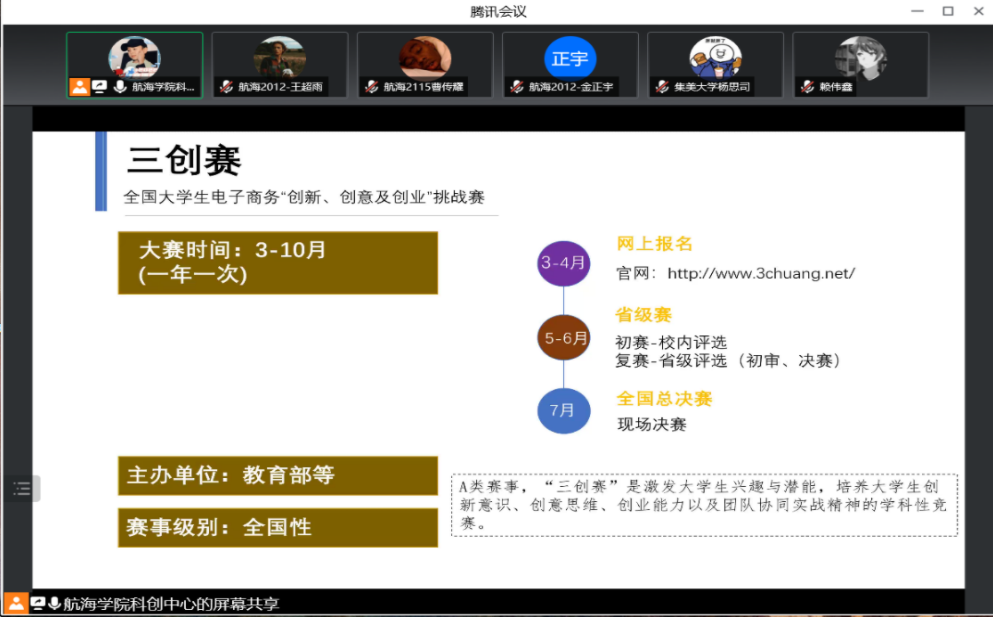 为了提高学生对创新创业工作的了解,培养学生树立创新创业意识,航海学院团委以线上形式举办创新创业工作培训会议。会议由创新创业工作指导老师杨思司主讲,院科创中心全体成员、各班科创委员等参加会议。