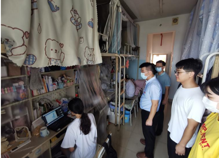 8月29日,新学期开学第一天,工商管理学院学工口干部到学生宿舍看望学生,关心同学们线上学习情况,了解新生宿舍安排情况,并检查相应学生宿舍区的消防安全等综治状况。