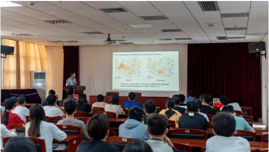 王智谨从病毒交叉感染的方式以及病毒传播的内因与外因展开他的学术报告,基于传染病对人类造成的重大威胁,他强调了传染病监管的重要作用,并提出了传染病预测的八大任务。他还详细地介绍了利用疾病遗传特征、空间和时间分辨率特征以及历史模型的局部关联来建立的预测模型。在座师生认真聆听了报告,了解了有关传染病的“预测模型”新技术。