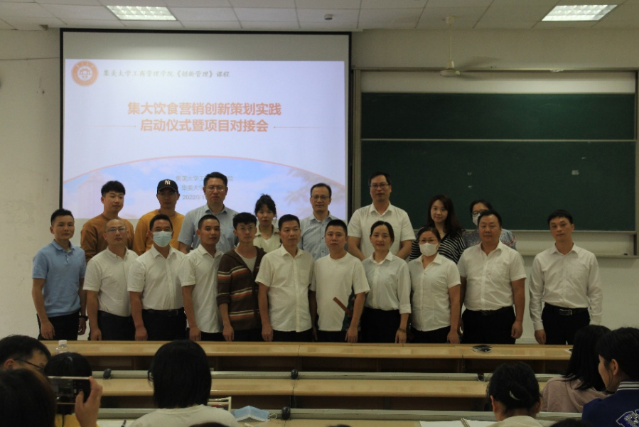 近期,工商管理学院与后勤集团饮食服务中心(简称“集大饮食”)联合开展产教融合实践教学,探索《创新管理》课程教学改革和人才培养新模式。10月19日下午,集大饮食营销创新策划实践启动仪式暨项目对接会在建发401顺利进行,集大后勤集团领导、集大饮食相关负责人、集大饮食各有关餐厅、糕点坊、订餐平台负责人,以及工商管理学院市场营销系负责人、课程组教师,和2020级市场营销、工商管理专业学生共同出席。
