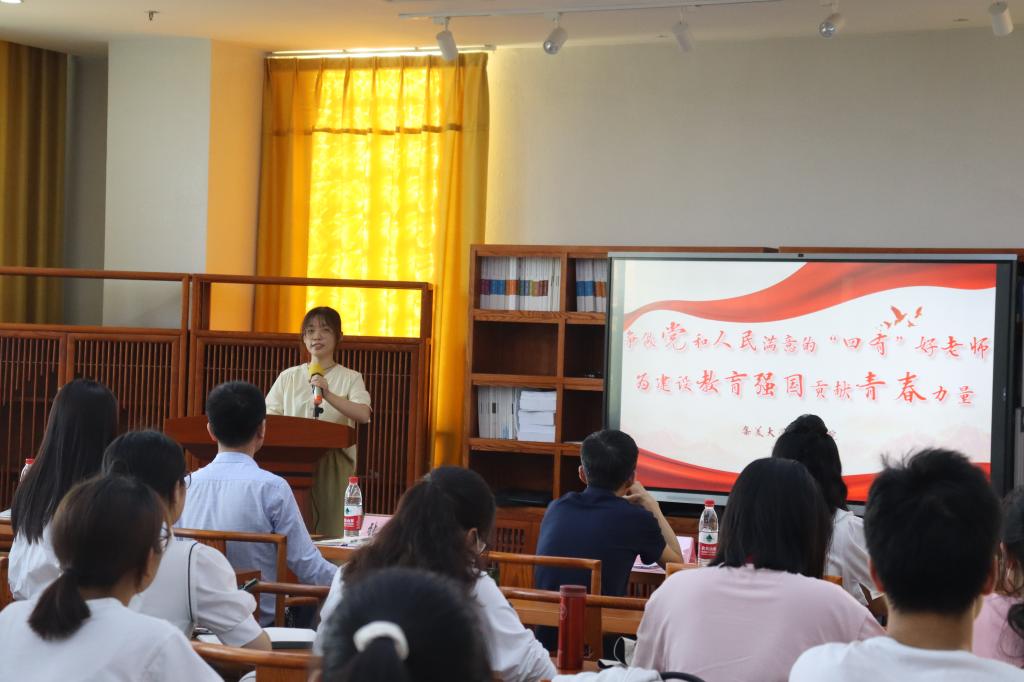 马克思主义学院祁小平老师以《中国式现代化的鲜明特色和本质要求》为题,通过我国共同富裕进程、人与自然和谐共生理念落地实效等丰富实例全面解读,激励广大学生为中国式现代化建设事业努力奋斗;师范学院辅导员叶定颖以《争做党和人民满意的“四有”好老师,为建设教育强国贡献青春力量》为题,重点阐述“四有好老师”的具体内涵,勉励师范生为建设教育强国贡献青春力量;师范学院学生代表张小敏、郭丹盈、颜羽萱共同以《以青年之姿,奋进教育之梦》为题,阐述了党和人民对新时代师范学子的期盼;师范学院学生代表蓝诗馨以跨时空对话的方式,突出表现了立青春之志、踏时代征程的主题。