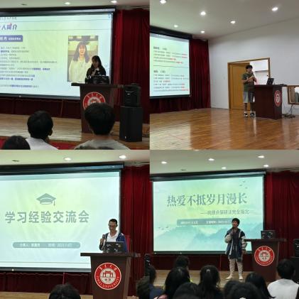 王玉芝、郭灏贤、付德政、杨冉四位同学分别从专业认识、学习方法、创新创业、学生干部经历、备考复习等方面进行了分享。