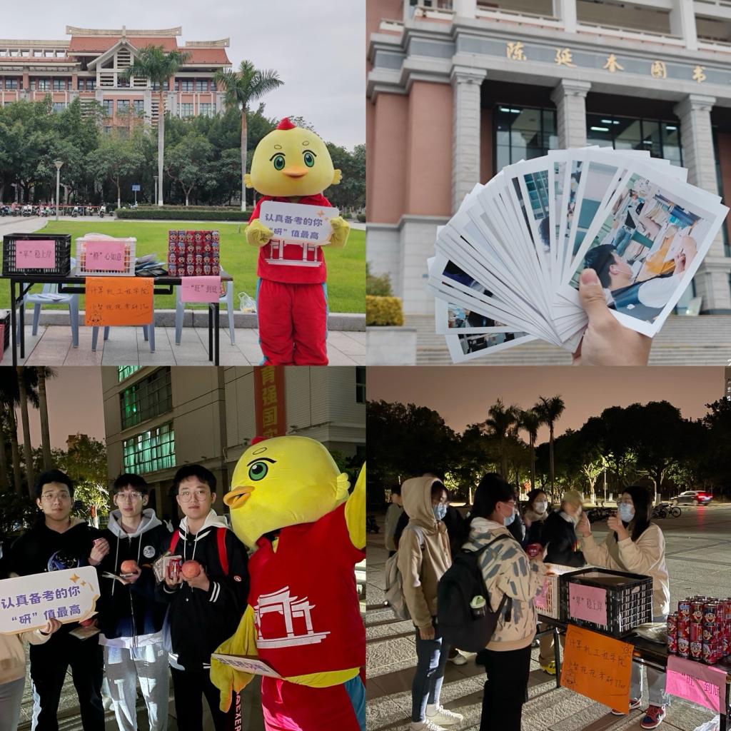 2024年全国硕士研究生招生考试开考在即,为舒缓考研学子复习压力,激励考研学子斗志,帮助考研学子坚定信心,12月17日,计算机工程学院分别在陈延奎图书馆和嘉庚图书馆广场处设考研助力点,为考研学子们送上承载美好寓意的考研礼物:记录他们努力备考模样的照片、吉祥物小智的暖心抱抱,希望他们能在考试中发挥最好的水平,实现自己的梦想。