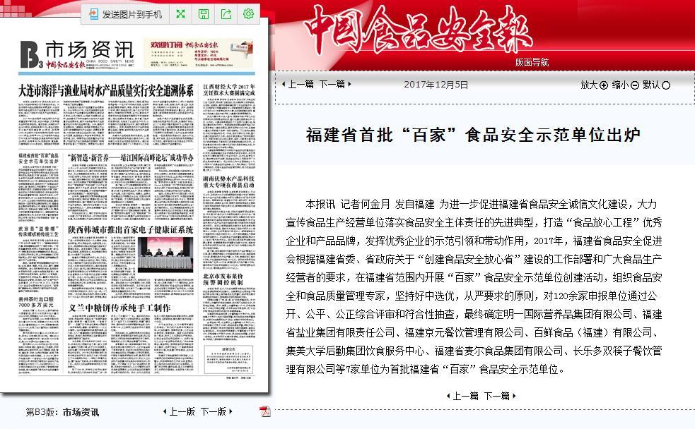 本报讯 记者何金月 发自福建 为进一步促进福建省食品安全诚信文化建设,大力宣传食品生产经营单位落实食品安全主体责任的先进典型,打造“食品放心工程”优秀企业和产品品牌,发挥优秀企业的示范引领和带动作用,2017年,福建省食品安全促进会根据福建省委、省政府关于“创建食品安全放心省”建设的工作部署和广大食品生产经营者的要求,在福建省范围内开展“百家”食品安全示范单位创建活动,组织食品安全和食品质量管理专家,坚持好中选优,从严要求的原则,对120余家申报单位通过公开、公平、公正综合评审和符合性抽查,最终确定明一国际营养品集团有限公司、福建省盐业集团有限责任公司、福建京元餐饮管理有限公司、百鲜食品(福建)有限公司、亚洲中文精品乱码后勤集团饮食服务中心、福建省麦尔食品集团有限公司、长乐多双筷子餐饮管理有限公司等7家单位为首批福建省“百家”食品安全示范单位。