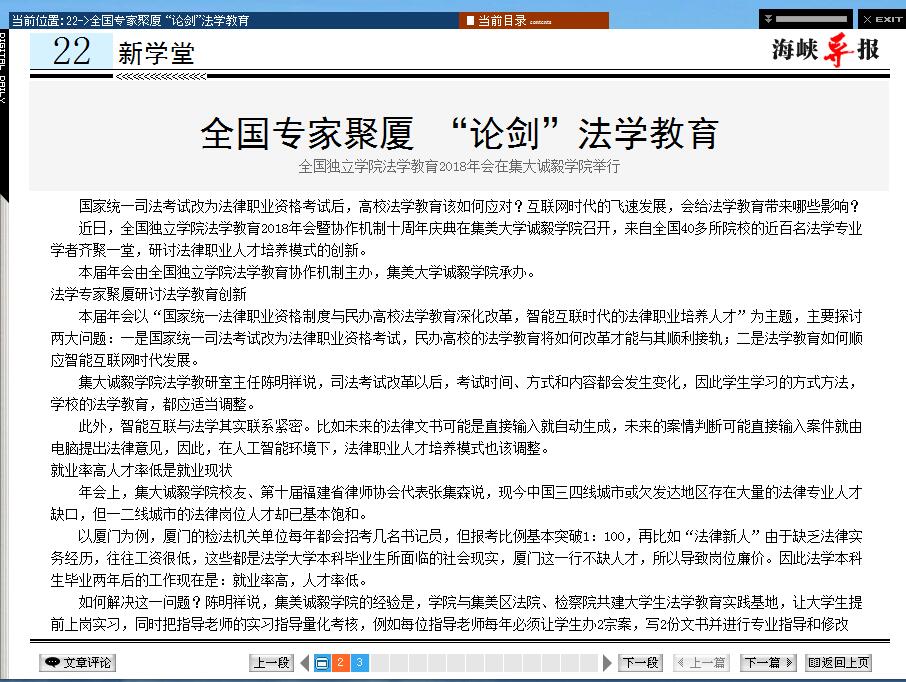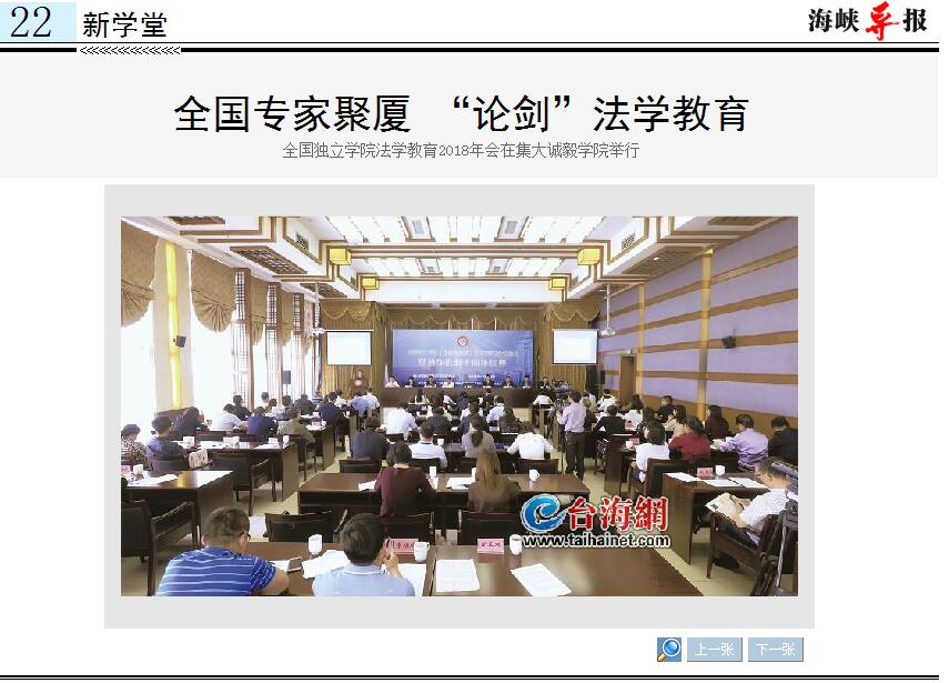 另悉,《海峡导报》4月24日以全国专家聚厦 “论剑”法学教育为题报道全国独立学院法学教育2018年会在集大诚毅学院举行消息,相关转载链接:http://cynews.jmu.timcu.com/info/1004/4240.htm。
