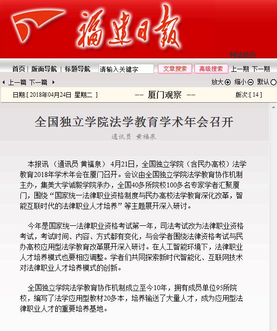 4月24日,《福建日报》第14版报道全国独立学院法学教育学术年会召开消息,现全文转载如下:http://fjrb.fjsen.com/fjrb/html/2018-04/24/content_1102275.htm?div=-1