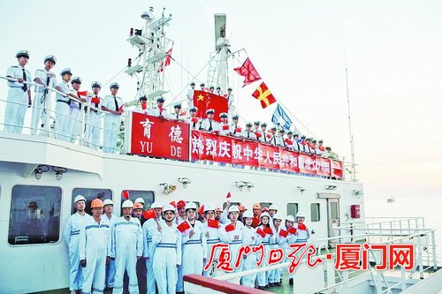 集美航海学子在“育德”轮上庆祝新中国成立70周年。