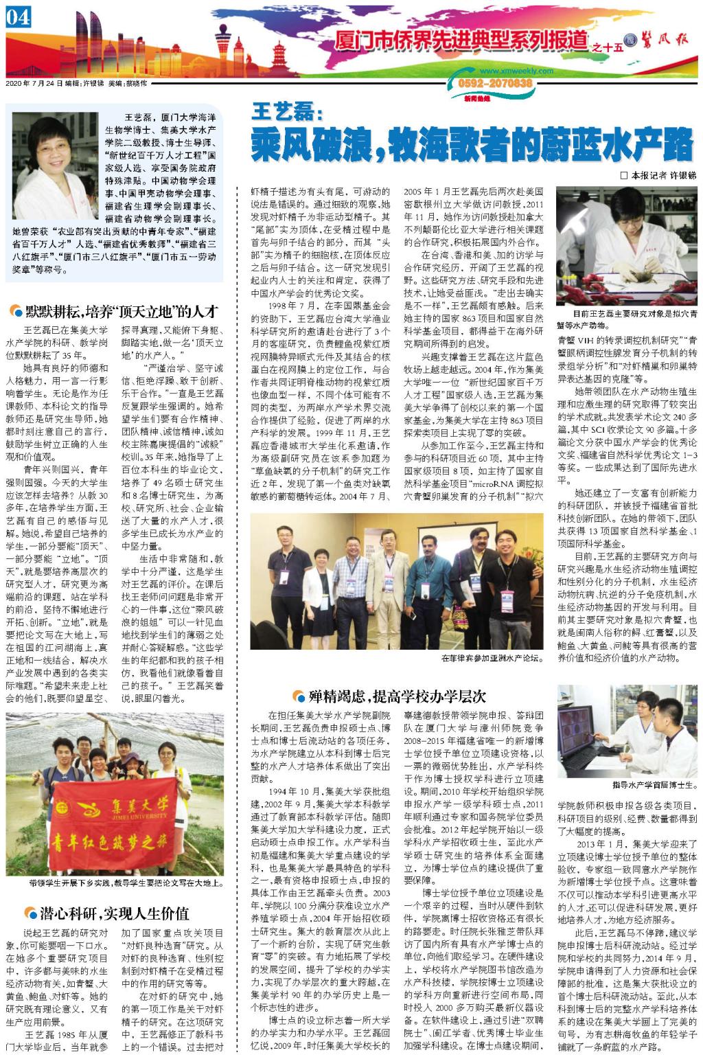 “严谨治学、坚守诚信、拒绝浮躁、敢于创新、乐于合作。”一直是王艺磊反复跟学生强调的。她希望学生们要有合作精神、团队精神、诚信精神,诚如校主陈嘉庚提倡的“诚毅”校训。35年来,她指导了上百位本科生的毕业论文,培养了49名硕士研究生和8名博士研究生,为高校、研究所、社会、企业输送了大量的水产人才,很多学生已成长为水产业的中坚力量。