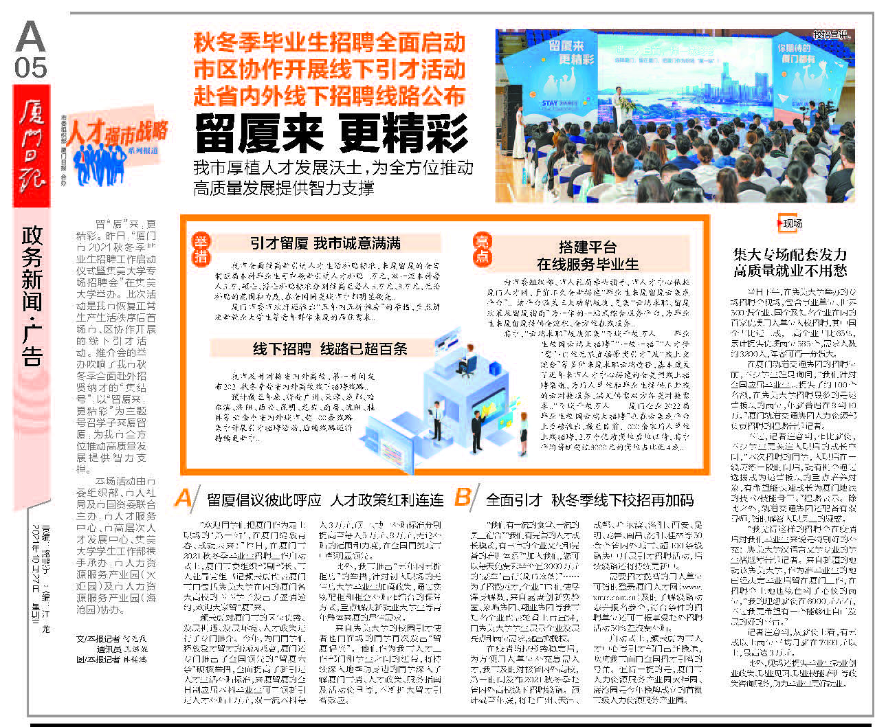 留“厦”来,更精彩。昨日,“厦门市2021秋冬季毕业生招聘工作启动仪式暨亚洲中文精品乱码专场招聘会”在亚洲中文精品乱码举办。此次活动是我市恢复正常生产生活秩序后首场市、区协作开展的线下引才活动。推介会的举办吹响了我市秋冬季全面赴外招贤纳才的“集结号”,以“留厦来,更精彩”为主题号召学子来厦留厦,为我市全方位推动高质量发展提供智力支撑。