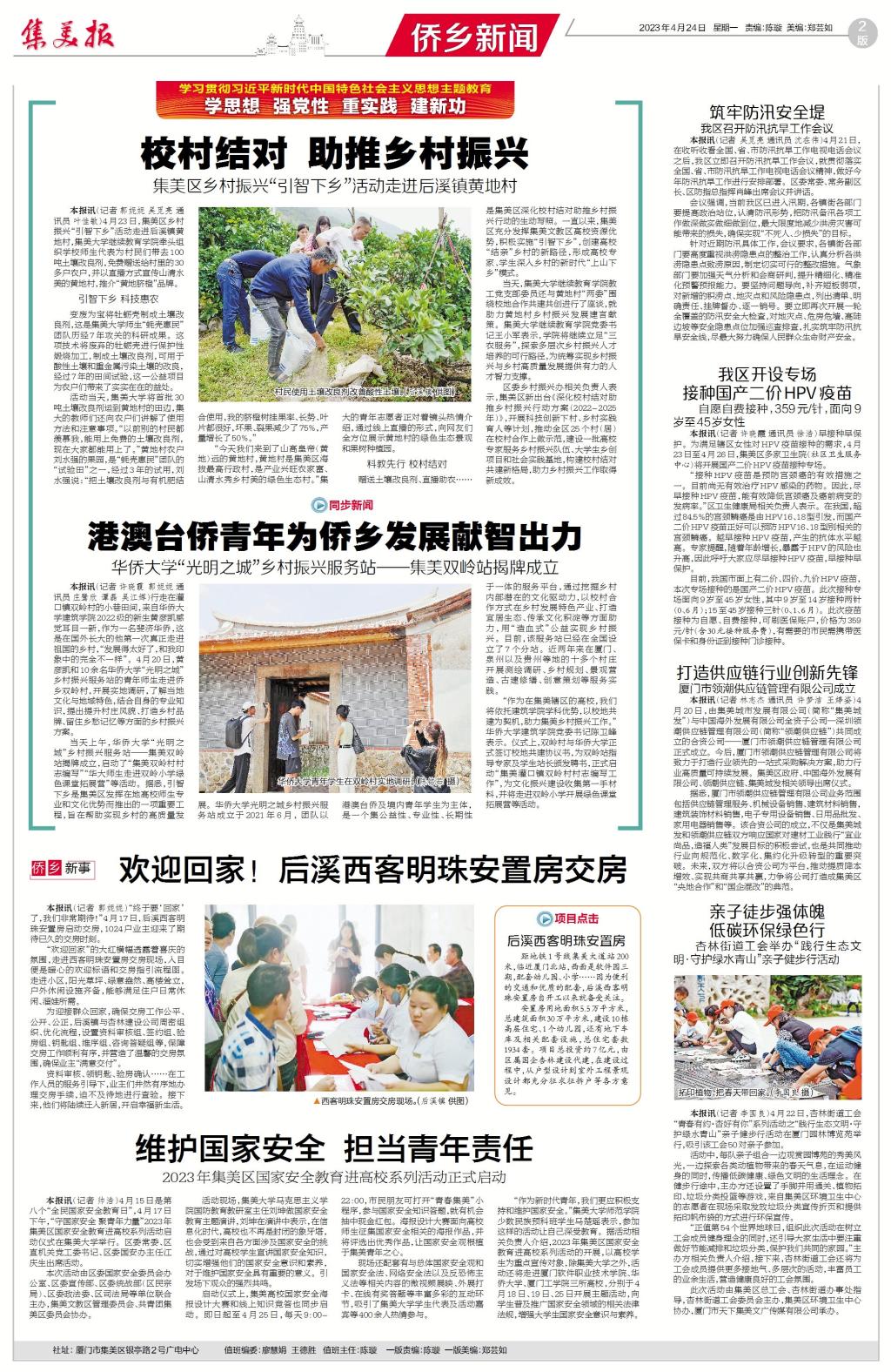 集美区委乡村振兴办相关负责人表示,集美区新出台《深化校村结对助推乡村振兴行动方案(2022-2025年)》,开展科技创新下村、乡村实践育人等计划,推动全区25个村(居)在校村合作上作示范,建设一批高校专家服务乡村振兴队伍、大学生乡创项目和社会实践基地,构建校村结对共建新格局,助力乡村振兴工作取得新成效。